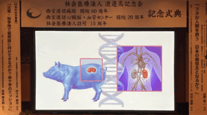 西宮渡辺病院開院60周年記念式典に出席してきました。 民間病院でありながら救急医療やへき地医療など、地域に不可欠な公益性の高い医療を安定的に提供している事から社会医療法人の認可も得て15年。多くの医療関係者が出席しての盛大な式典・祝賀会でした。 記念講演ではハーバード大学医学部外科教授でマサチューセッツ総合病院レゴレッタ臨床移植免疫寛容センター長の河合達朗さんの「ブタが人類を救う」という豚の腎臓移植の話。難しい話なのに分かりやすく説明して頂きとても面白い講演でした。 祝賀会では藪恵壹さんと記念撮影。大きかったですが顔の大きさでは負けてないので良しとしておきます。